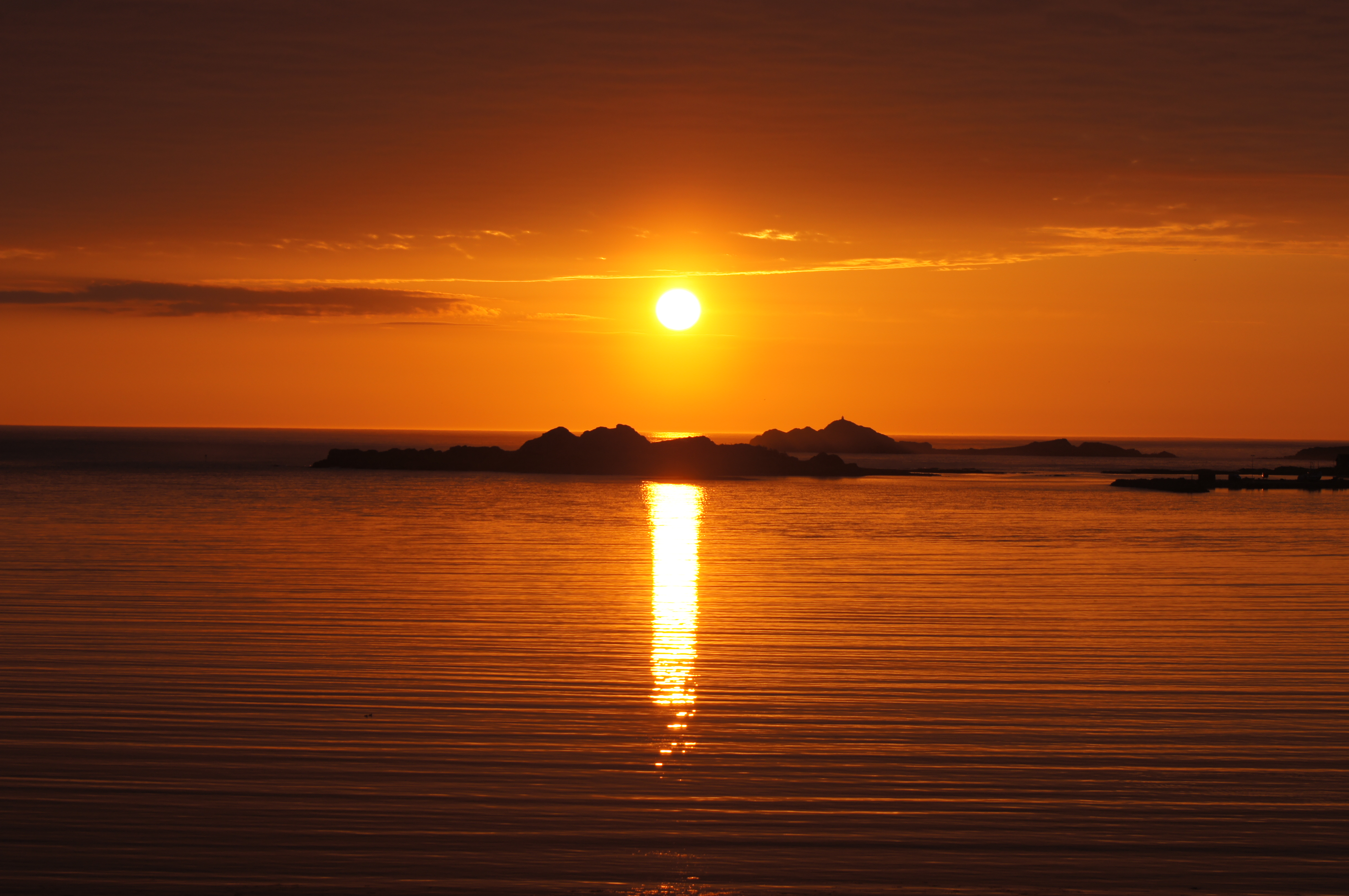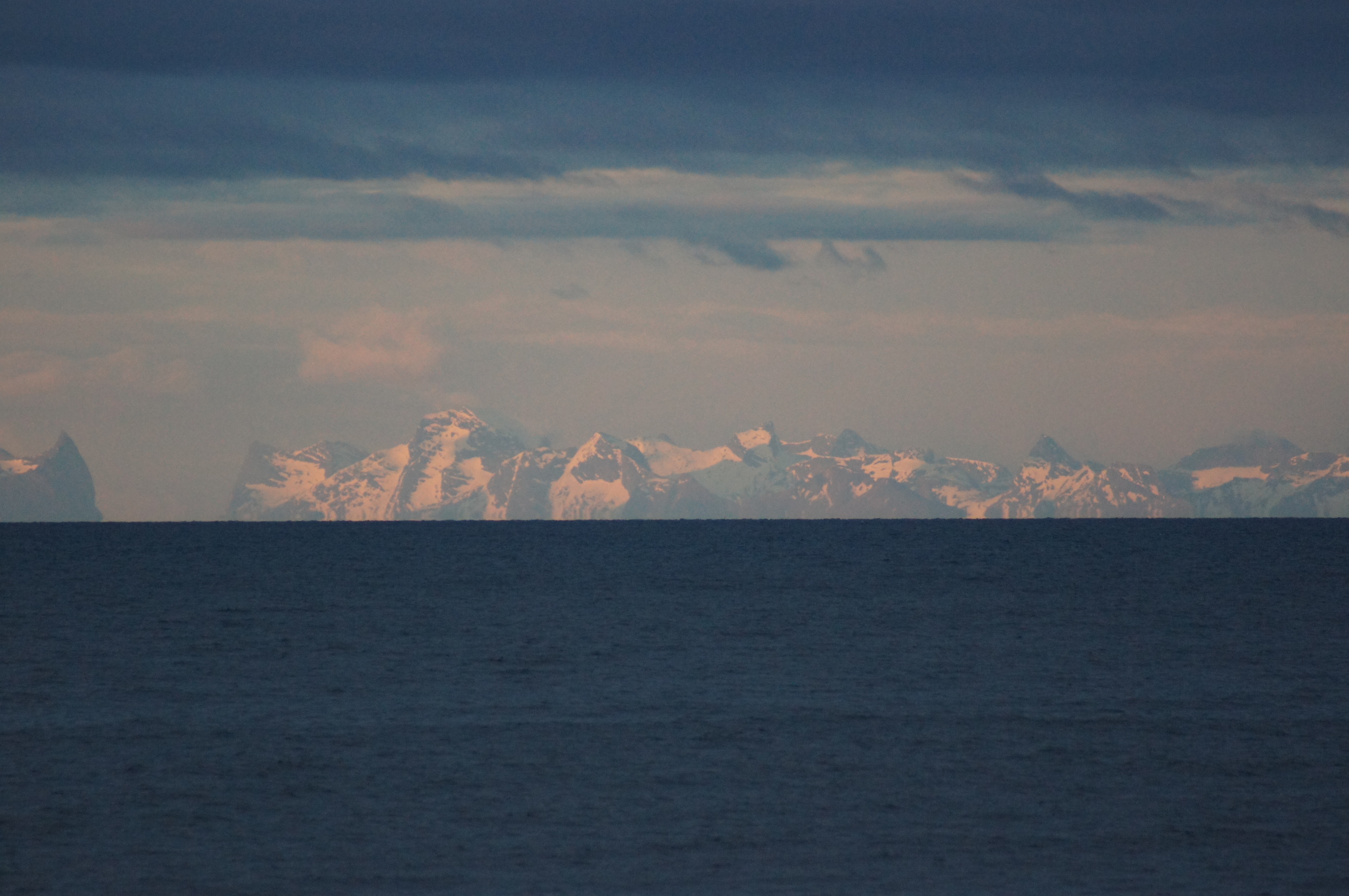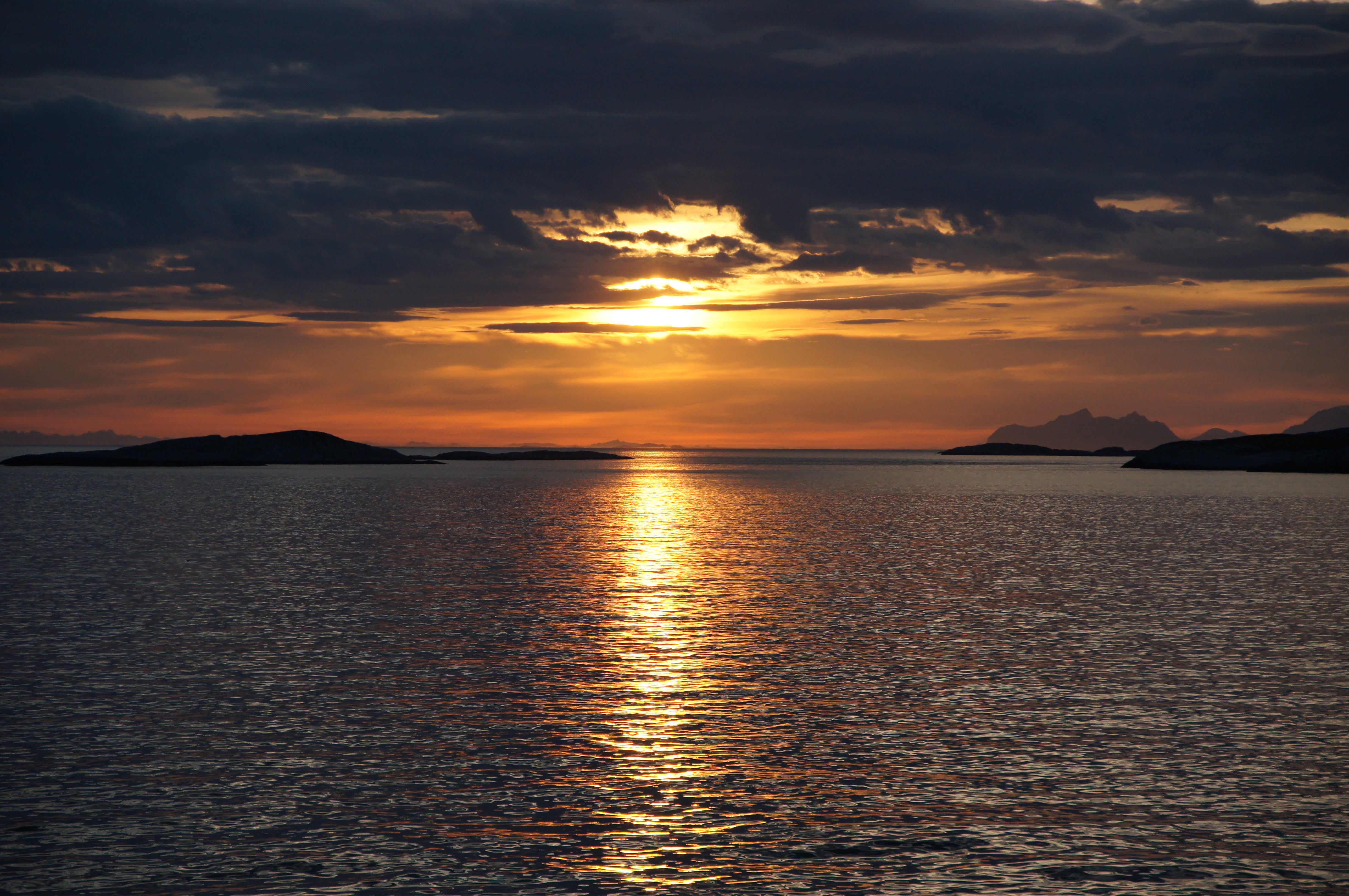 ... denn da war sie: über ruhiger See begrüßte uns unsere erste "Mitternachtssonne" um Viertel vor drei Uhr morgens in goldenen Farben vor der fernen fast im Meer versinkenden Silhouette der Gebirgskette der Lofoten im Norden. Ein eindrucksvolles Landschaftsbild, das wir versuchten für die Erinnerung einzufangen.