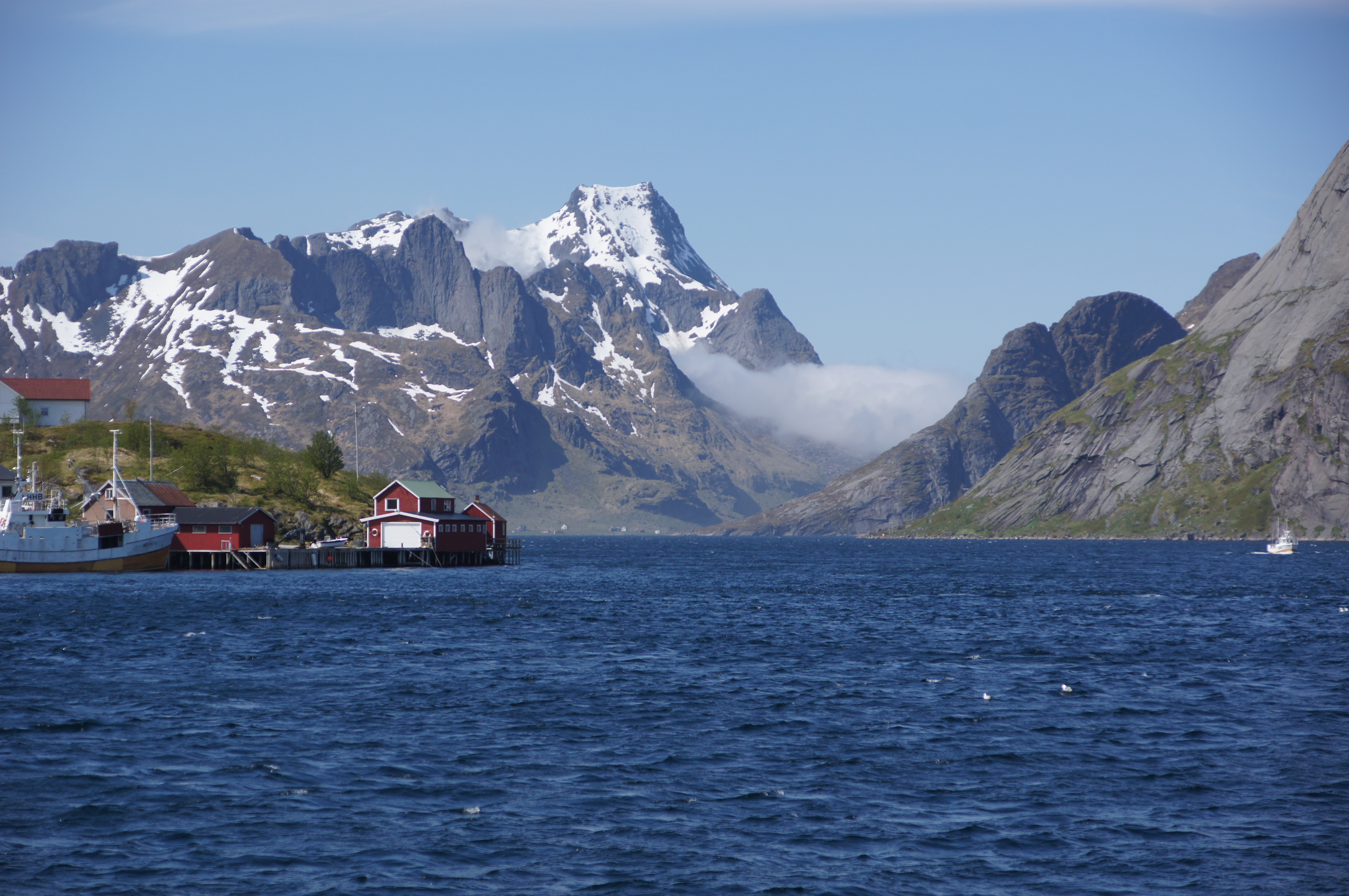 An Flakstad vorbei und die menschenleere E10 am Flakstadpollen entlang erreichten wir wenig später das Museumsdorf Nusfjord. Dieses Kleinod aus dem 19. Jahrhundert war einst eines der bedeutendsten Kaufmannsdörfer auf den Lofoten und wichtiges Zentrum der Lofotenfischerei. Mit dem Niedergang der Fischerei im 20. Jahrhundert verfiel dieser Ort zunächst in Bedeutungslosigkeit, bis er als originalgetreu restauriertes Museumsdorf bis heute