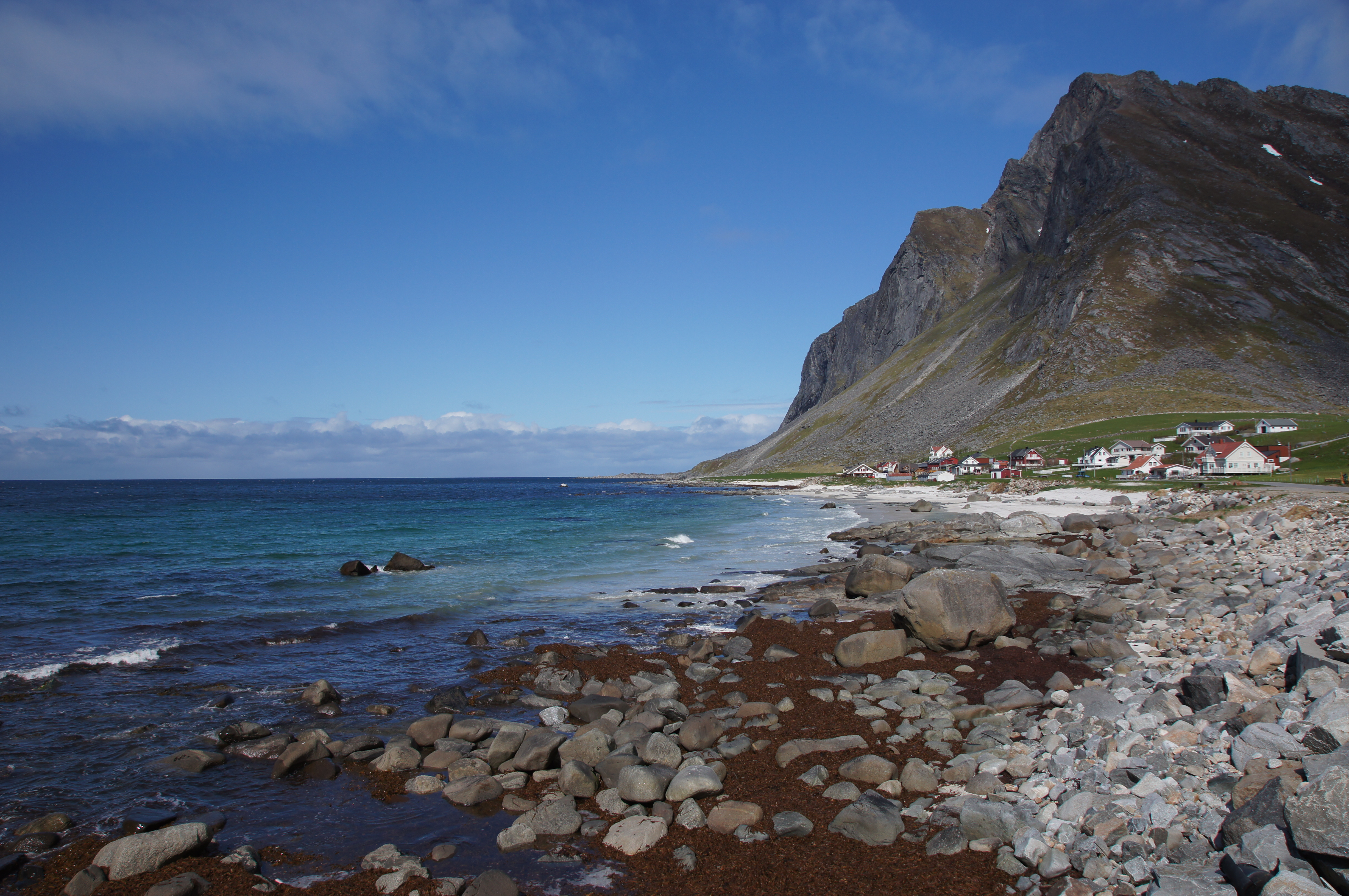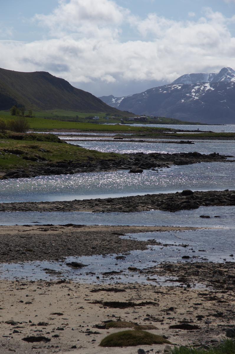 Noch während eines kleinen Strandspaziergangs am "Südseestrand" der Justnesvika riss die Wolkendecke über dem Meer auf und bei frischer nordwestlicher Brise sollten wir unser erstes Tagesziel Vikten auf Flakstadsøya bei Sonnenschein erreichen.
