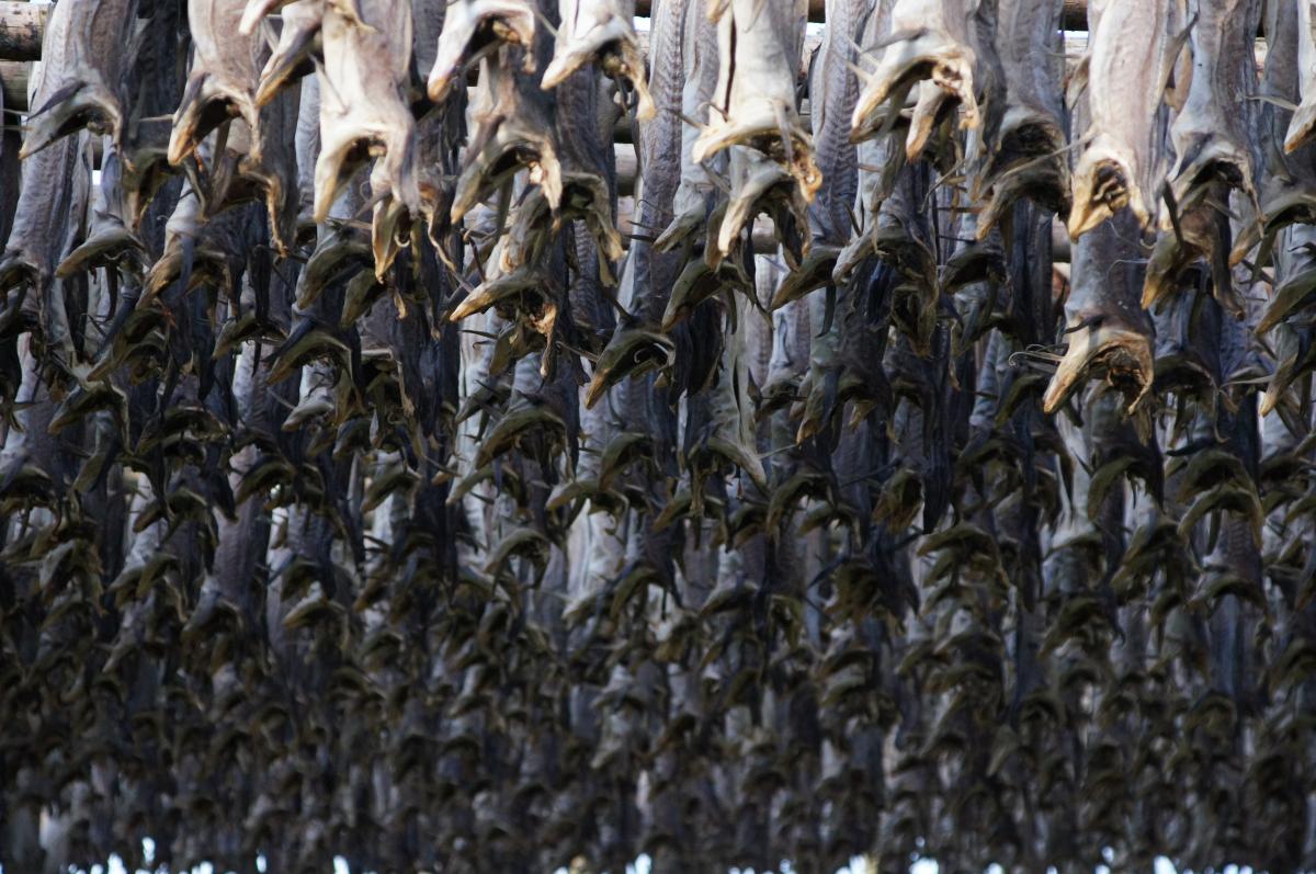 Jeden Winter ziehen große Schwärme von Kabeljau (Dorsch) aus den Gewässern des nördlichen Eismeeres rund um Spitzbergen und der Barentssee in ihre wärmeren Laichgründe zwischen den Lofoten und dem Festland, um in den Monaten Januar bis April dort tonnenweise in den Netzen der Lofotfischer zu landen. Seit Jahrhunderten wird er -entsprechend ausgenommen- anschließend in der trockenen Polarluft über Holzgestellen (no. stokk) für mehrere Wochen luftgetrocknet. Über den gesamten Archipel verteilt hängen in dieser Zeit die Stockfischgestelle voll und überziehen den Küstensaum mit ihrem markanten Geruch nach Fermentierung. (Mehr über die Geschichte und Bedeutung des Stockfischs (no. Torsk), und warum ausgerechnet Italien wichtigstes Abnehmerland ist, finden Sie z.B. im Lofotenführer von Michael Möbius und Annette Ster.)